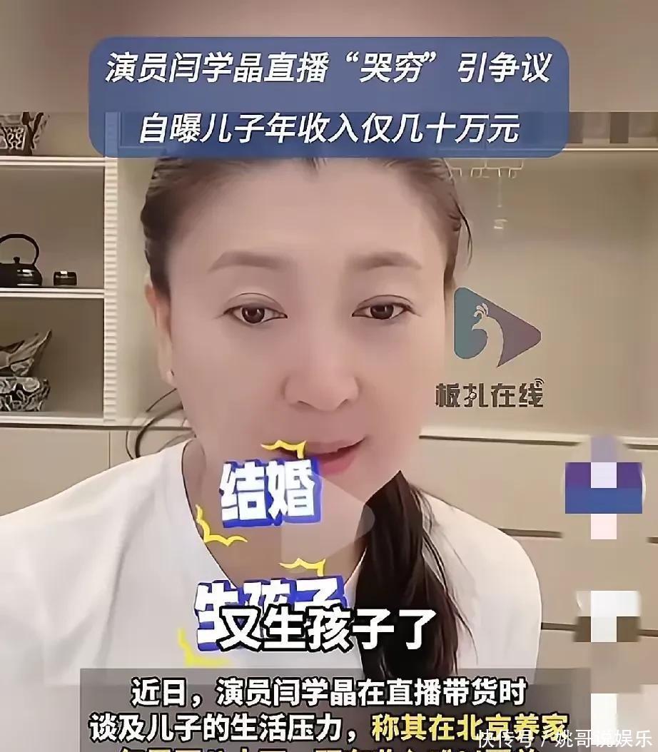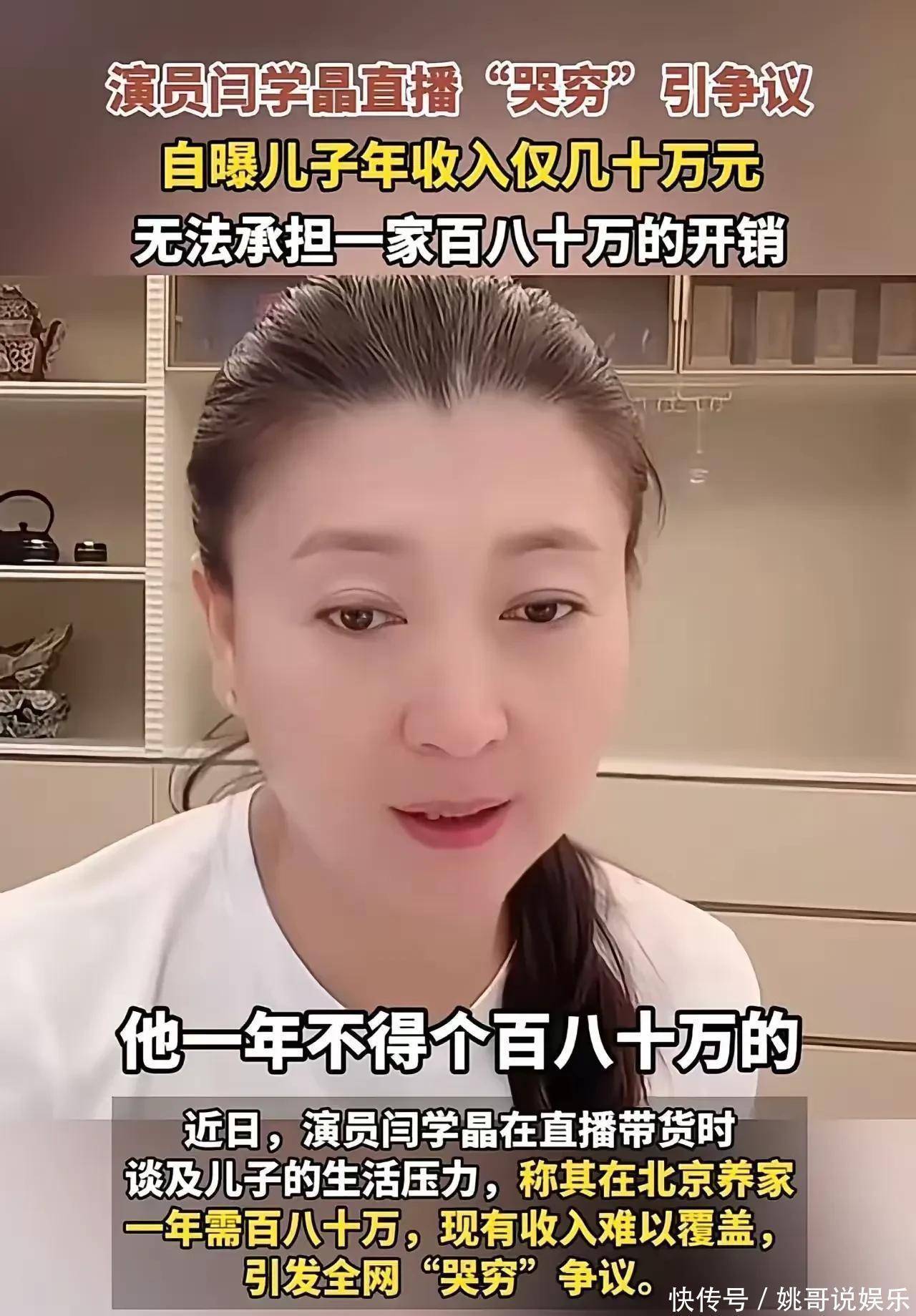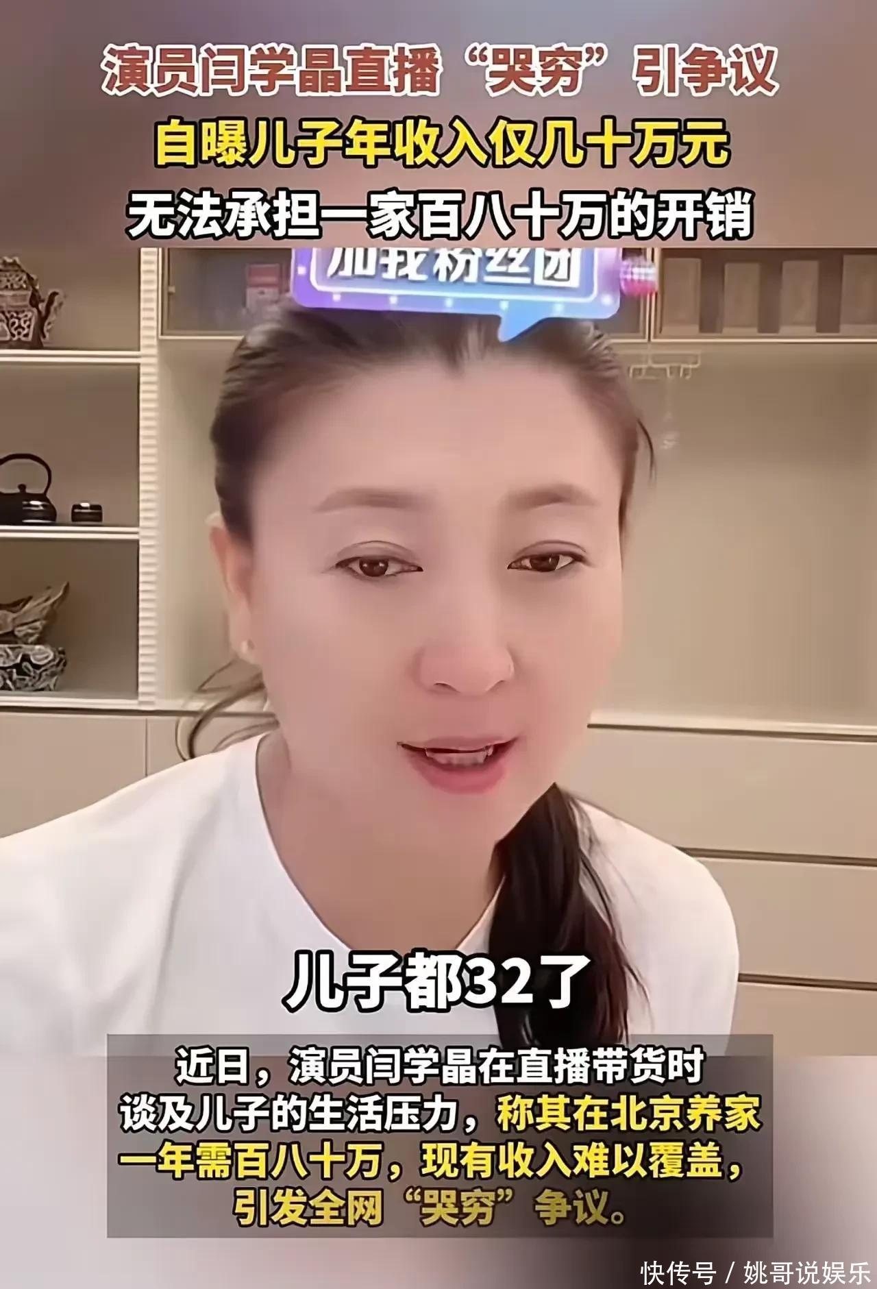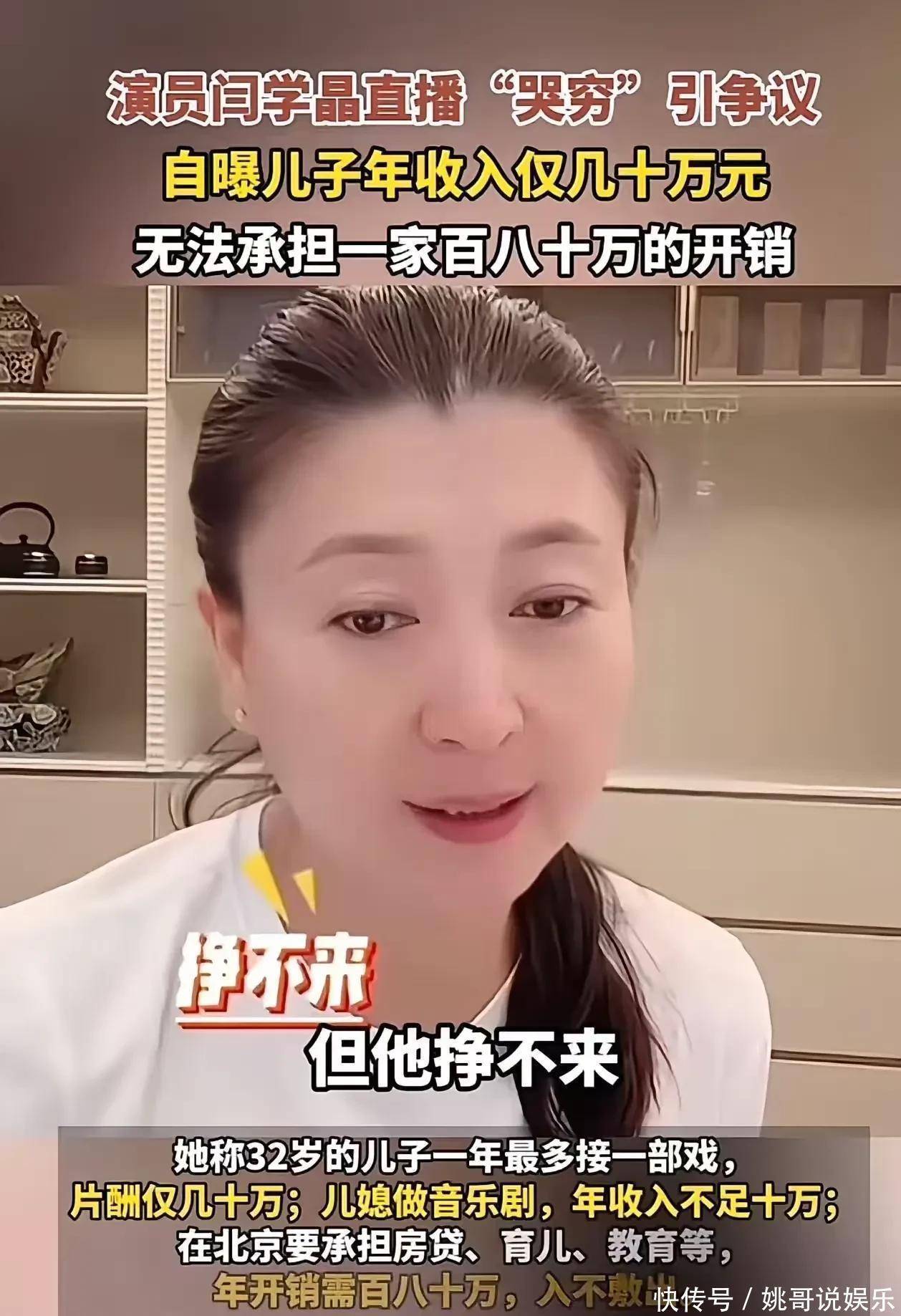 风波起点:直播间里的“家庭账本”直播中,闫学晶满脸愁容地算起账:32岁的儿子林傲霏(中戏毕业演员)一年最多接一部戏,片酬仅二三十万元;儿媳是音乐剧演员,年收入不足十万元,小两口全年总收入不到40万。而在北京养孩子、还房贷、承担教育与日常开销,一年需要80-100万元才能维持运转,缺口达40-60万元,全靠她直播带货补贴。她还透露自己月退休金仅5000多元,近年减产,为帮儿子减压,每天清晨6点半就开播,甚至带病播到晕倒,直言“不敢停,一停儿子一家就可能喝西北风”。面对网友“几十万已经很高”的质疑,她皱眉回应“你不知道北京的消费啊”,进一步激化矛盾。