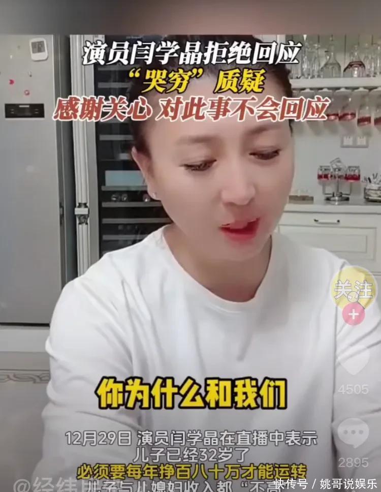 舆论反转:“哭穷”被扒与认知鸿沟这番话迅速引发轩然大波,核心争议点在于明星与普通大众的生活标准割裂:对多数人而言,年入三四十万已是中产水平,而闫学晶口中却成了“不够花”;有网友扒出她过往分享的日常——餐桌上常有11个菜,早餐有海参、龙虾,客厅大到能打球,与“哭穷”形成强烈反差。同时,她直播带货成绩亮眼(2025年11月单场交易额破230万),短视频广告报价7.3万-12万,几次合作即可覆盖儿子家开支缺口,其“哭穷”被指是为带货博同情。#闫学晶哭穷#话题阅读量很快突破6.3亿,二创内容刷屏,舆论一边倒地质疑其“脱离群众”。